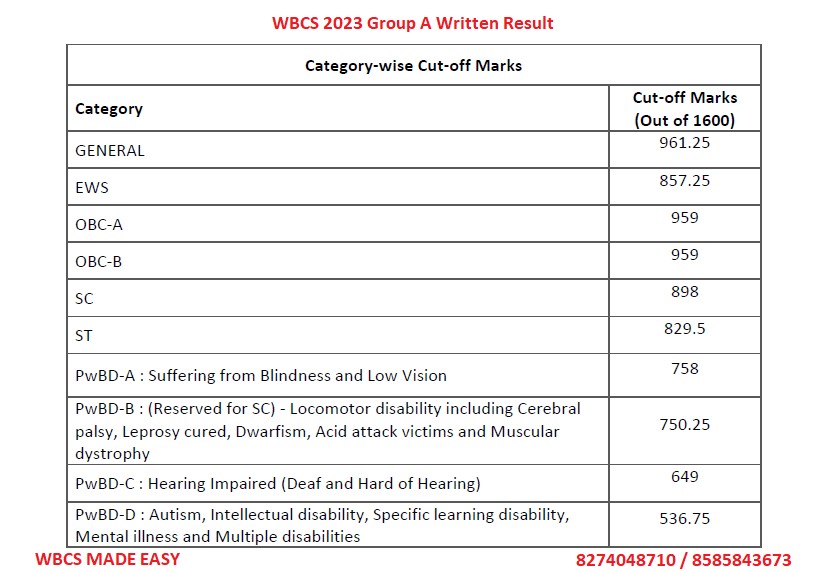 WBCS 2023 Group A Written Result – Category-wise Cut-off Marks (Out of 1600)