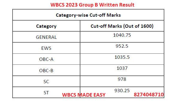 WBCS 2023 Group B Written Result – Category-wise Cut-off Marks (Out of 1600)